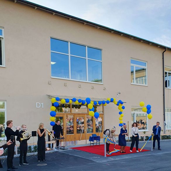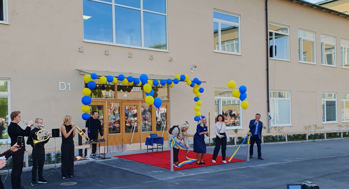 2023.09.28 Under nästan två år har arbetet med att bygga en ny konceptskola samt utbyggnad av matsal på Bromma Gymnasium pågått. En solig torsdagseftermiddag i september fylldes skolgården av projekt-representanter, elever och lärare för invigning av byggnader och konstverk. När SISAB:s VD Ebba Agerman, rektor Gunilla Blomqvist och Stockholms skolborgarråd Emilia Bjuggren klippte bandet framför entrén till den nya skolbyggnaden ljöd fanfaren från blåsorkestern och applåderna från åskådarna. Nu är det officiellt invigt!