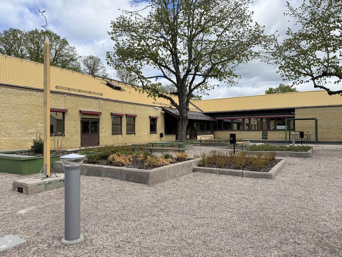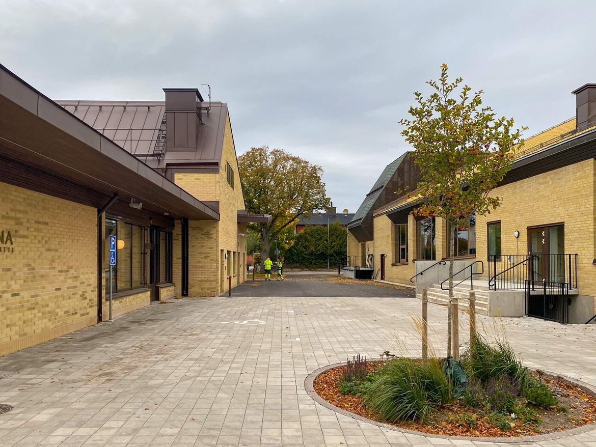 Vi hade i början tankar om ett gårdsrum mot hus A likt de gårdsrum som bildas på den befintliga skolgården, men framför allt var det viktigt att inte inkräkta på stråket genom skolområdet och att behålla så mycket av parkmiljön som möjligt. I och med att matsal och kök flyttades ut ur hus A så frilades ytor för övrig verksamhet. Bildsalen som förut legat i hus E kunde på det sättet flytta in i aulabyggnaden för att hamna i närheten av musiksalen vilket var ett önskemål från verksamheten då samverkan mellan bild och musik är viktig