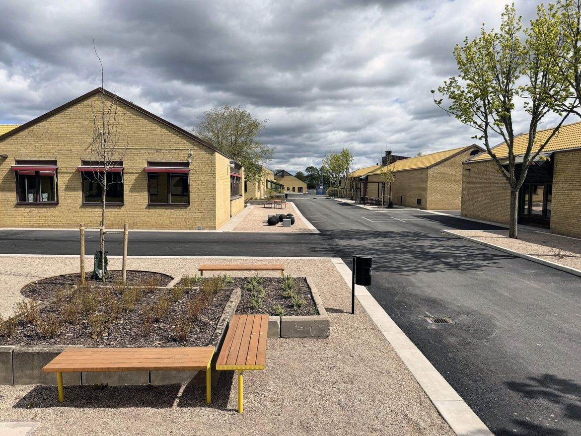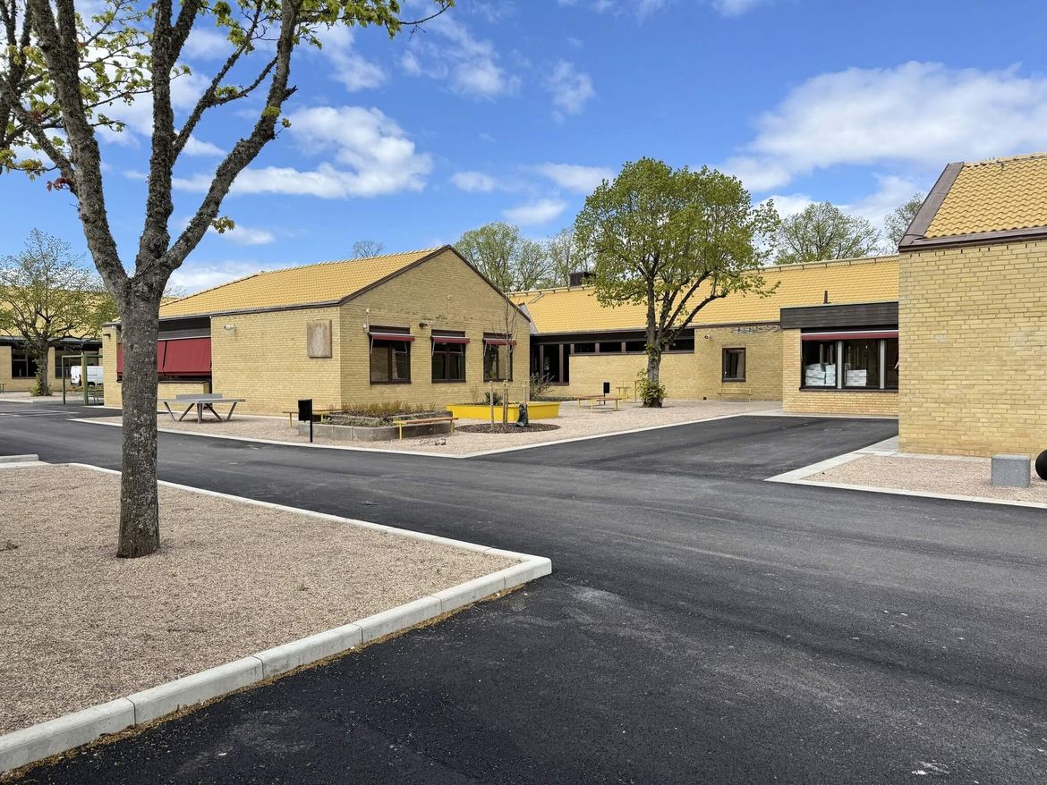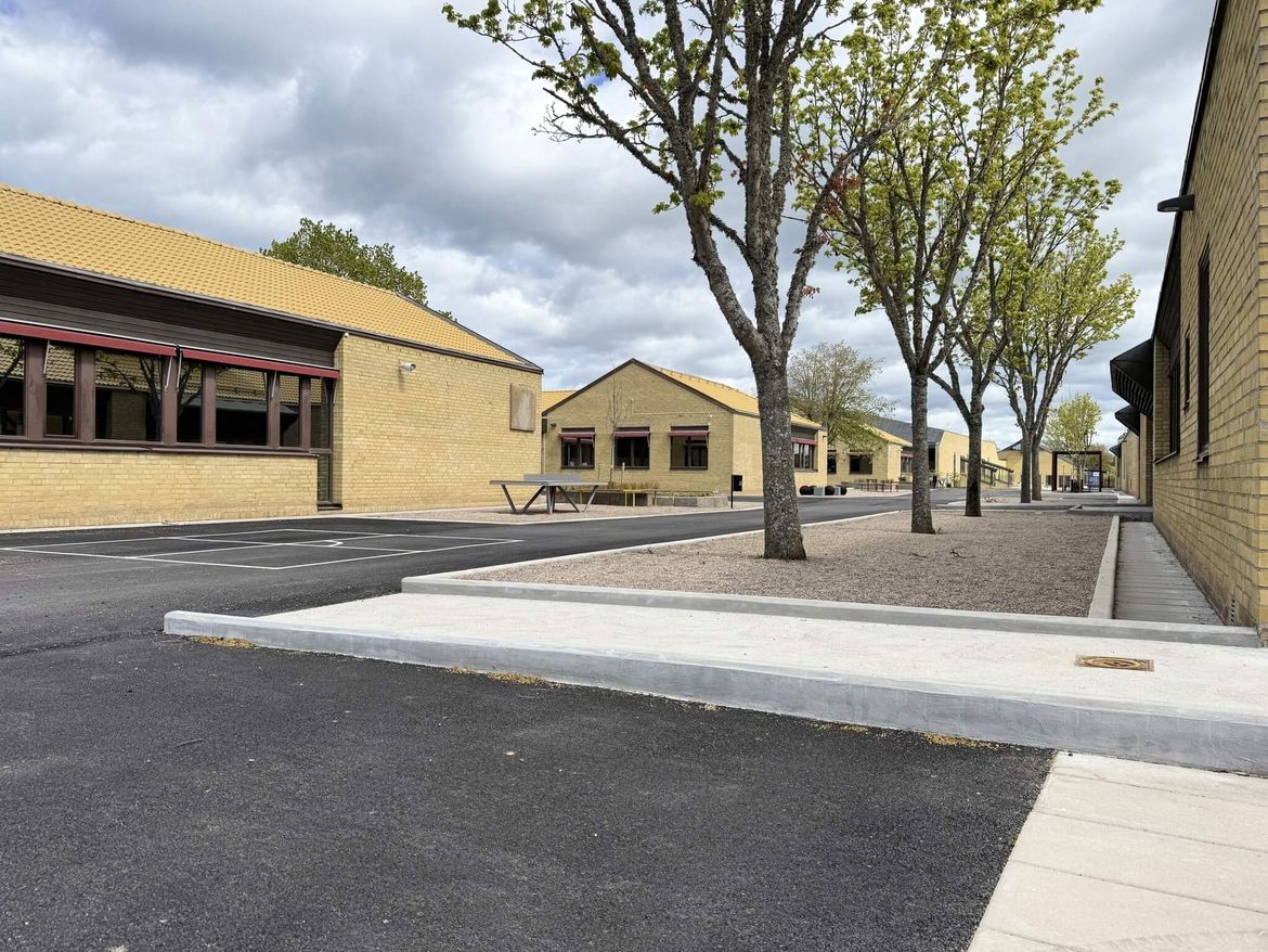 Byggnaderna har genomgående fasader av gult tegel och sadeltak respektive valmade tak belagda med gula betongpannor. Alla byggnader på själva skolområdet är i ett plan utom aulabyggnaden som höjer sig över de andra med sitt karaktäristiska tak