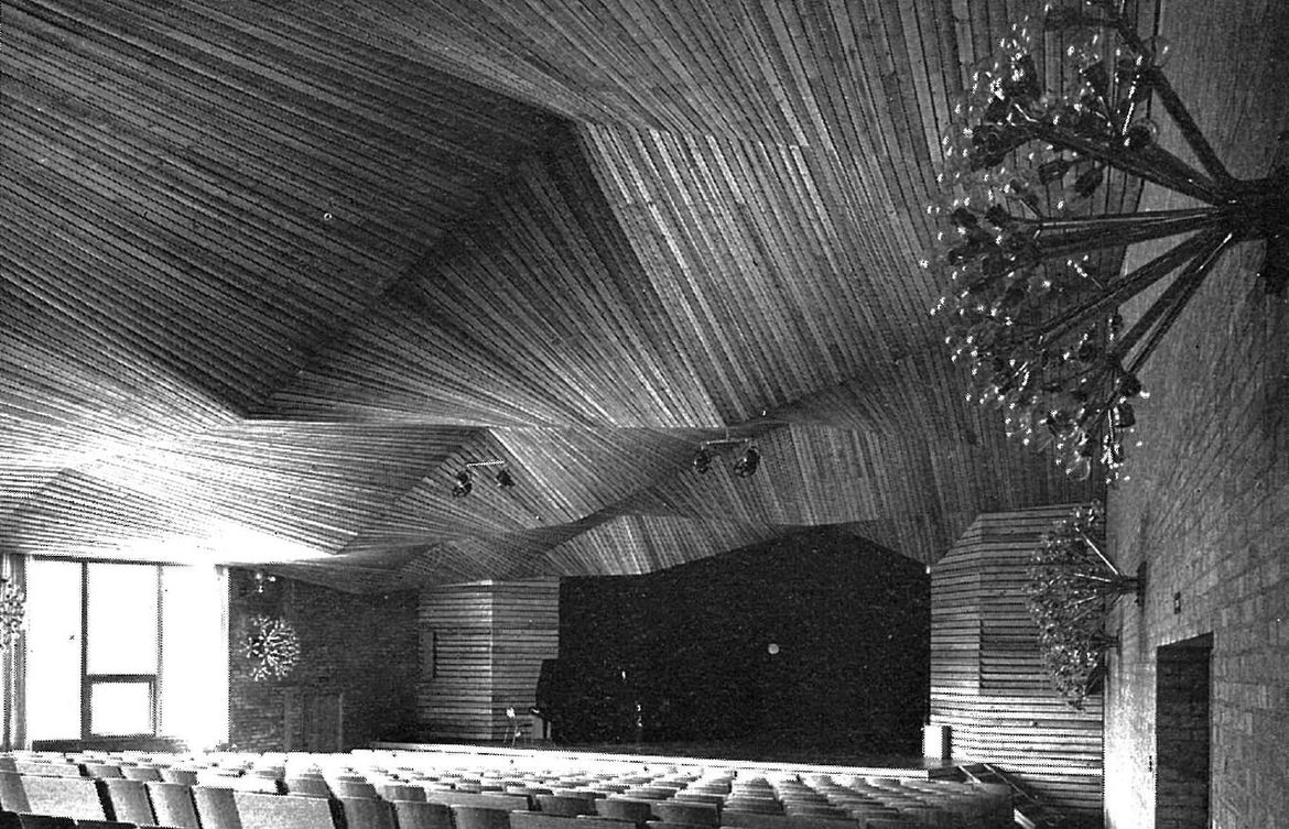 I hus A, aulabyggnaden som förutom aula även inrymmer foajé, en musiksal och den ursprungliga matsalen har trätaken formats i böljande mönster som skapar en alldeles egen karaktär. På bilder från artikeln i arkitektur 1968 ser man aulan och även den ursprungliga matsalen med det karaktäristiska taket. Ett senare tillkommet undertak i matsalen döljer idag detta tak, men i både aula, foajé och musiksal är det fortfarande synligt och förblev så även efter vår renovering och ombyggnation. Skolan var även i övrigt mycket välbevarad vad gäller den ursprungliga gestaltningen och inga större ingrepp hade gjorts sedan byggnadstiden.