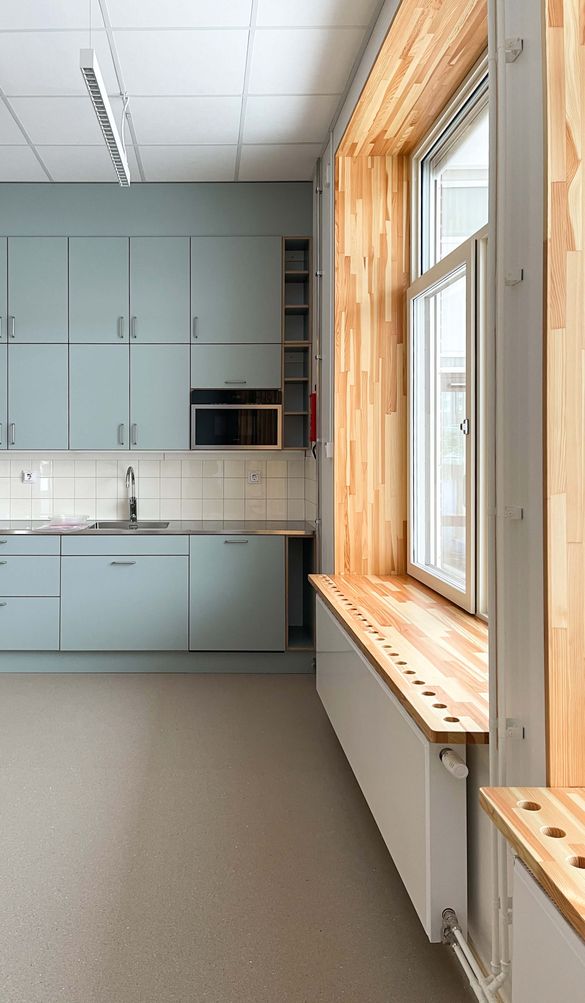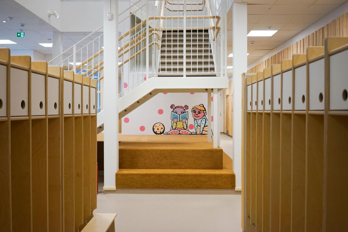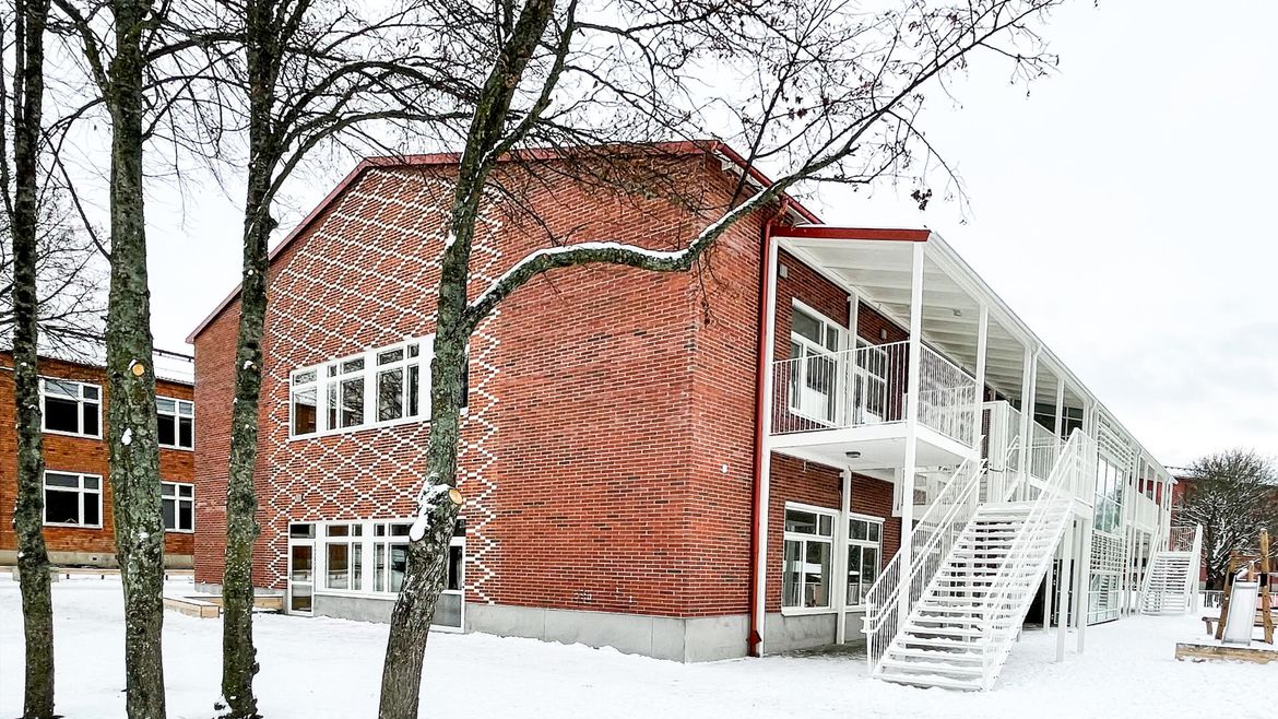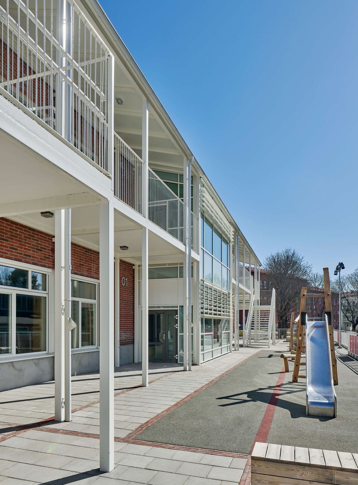 Den nya delen är som en mindre kusin till huvudbyggnaden, med ett murat tegelmönster på gavelfasaden som ansikte mot skolgården istället för huvudbyggnadens stora glasparti. Huset är byggt för att användas av barn i de lägre årskurserna men ligger omgärdat av lokaler för högre årskurser. För att skilja de olika åldrarna åt placeras den nya byggnaden på en upphöjd marknivå med lekredskap, sandlådor och skuggande träd, omgärdad av mur och staket.