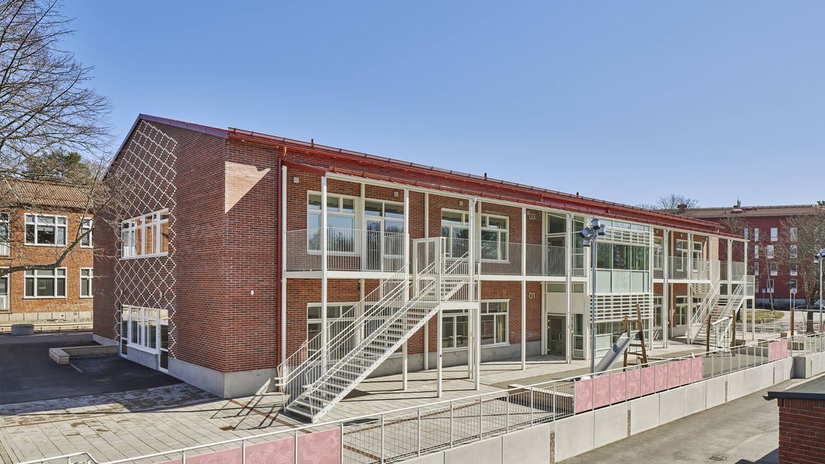 Sturebyskolans nya del. Sturebyskolan är en kommunal grundskola i Stureby i Stockholm för ca 1200 elever. Skolbyggnaderna uppfördes i olika etapper mellan åren 1951 och 1966 och ritades av Paul Hedqvist. År 2000 projekterade Stadion arkitekter en större renovering och modernisering av skolan som bland annat fick en ny byggnad för naturämnen, ett Sience center. Under 2010-talet projekterade kontoret ytterligare upprustning av bl a ventilation, gymnastiksal och storkök och har nu, 2017-21, även projekterat en ny byggnad med 8 nya klassrum.
